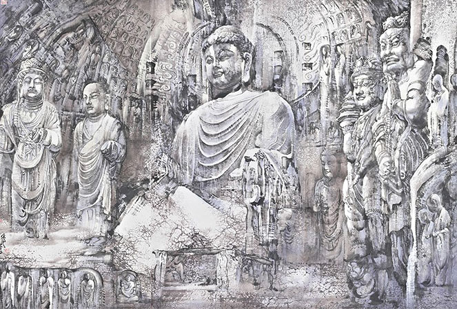 25余幅《墨寫龍門》系列作品,這既是段先生對佛教文化的一種闡釋,也是他藝術昇華的重要過程。他在堅硬的山體與莊嚴的佛尊之間,畫出宗教文化與民族文化交相輝映的精神圖騰。藝術家通過筆墨形式,將其直觀感受傳達給觀者,這一互動過程,使藝術家的作品獲得了新的生命,給人以強烈的視覺衝擊和心靈震撼。